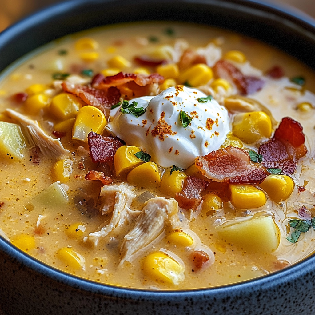 This creamy chicken corn chowder is loaded with tender potatoes, juicy corn, shredded chicken, and a rich, velvety broth. A touch of sour cream and half & half adds depth, while crispy Turkey Beef bacon brings it all together.