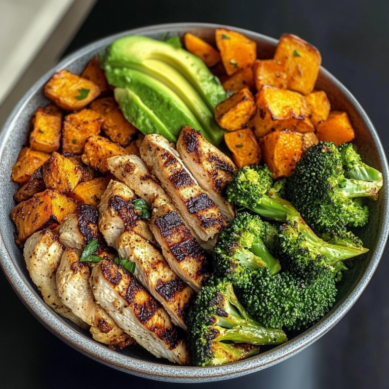 This grilled chicken veggie bowl with avocado is a wholesome, colorful meal packed with lean protein and roasted vegetables. Smoky paprika-seasoned sweet potatoes and tender broccoli pair perfectly with juicy grilled chicken and creamy avocado. It’s simple, nourishing, and ideal for meal prep or a balanced weeknight dinner.