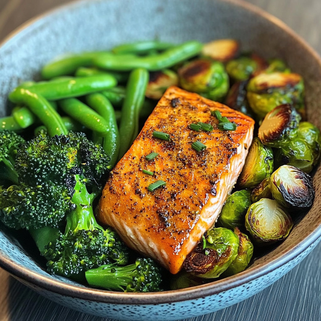 Indulge in a nutritious and flavorful Spiced Salmon Bowl with Roasted Brussels, Sautéed Greens & Steamed Broccoli. This vibrant dish combines perfectly spiced salmon with crispy Brussels sprouts and fresh green beans, all topped off with tender steamed broccoli. Ideal for quick weeknight dinners or meal prep, this bowl is as satisfying as it is visually appealing. With just 30 minutes of preparation and cooking time, you can enjoy a wholesome meal that keeps your health goals on track. Customize it with your favorite greens or seasonal vegetables to make it your own!
