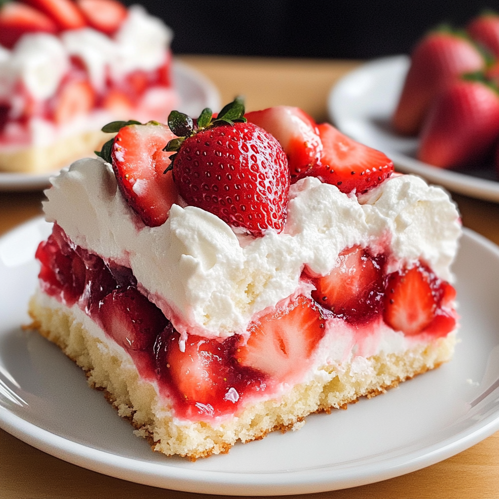 - Slice into pieces and enjoy this delightful Strawberry Shortcake Poke Cake!