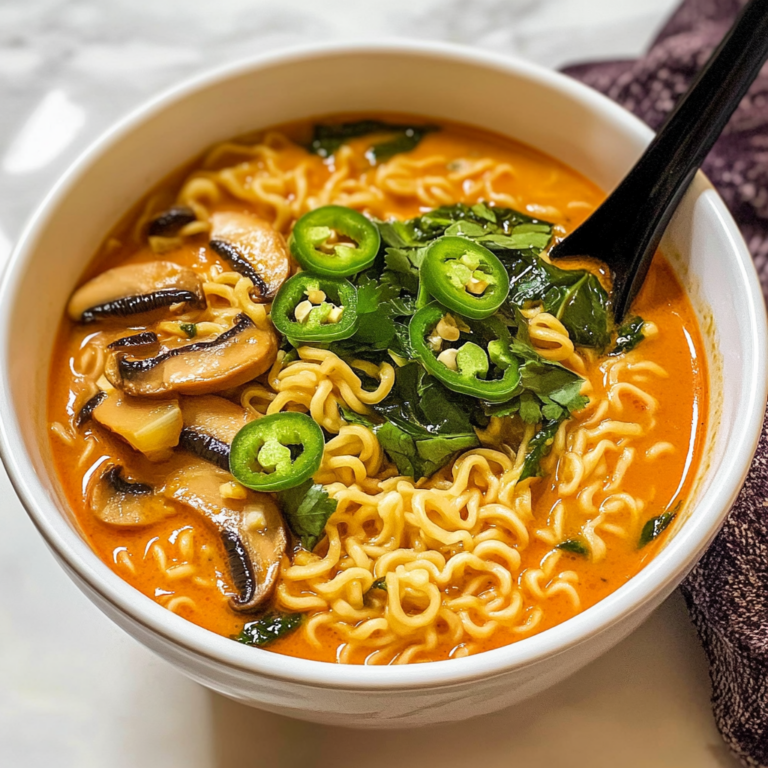 Experience a burst of flavors with this Thai Red Curry Ramen with Coconut Milk and Cilantro. This delightful dish combines creamy coconut milk and spicy Thai red curry paste, creating a rich broth that warms the soul. It’s perfect for busy weeknights or cozy gatherings, allowing you to customize your toppings for a personalized touch. Fresh vegetables like spinach and mushrooms add nutrition, making each bowl not just comforting but also wholesome. Ready in under an hour, this ramen is an easy weeknight meal that will impress your family and friends alike.